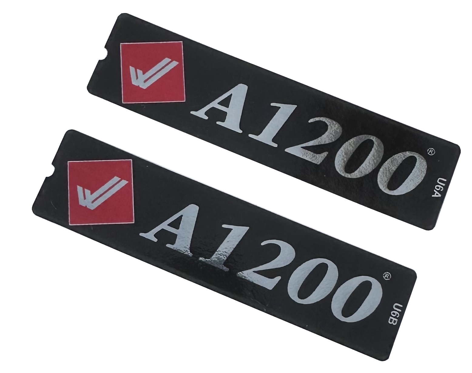Set of 2 labels marked U6A and U6B. A1200 logo has silver metallic appearance. Double check/tick is also silver in colour on a red metallic diamond.