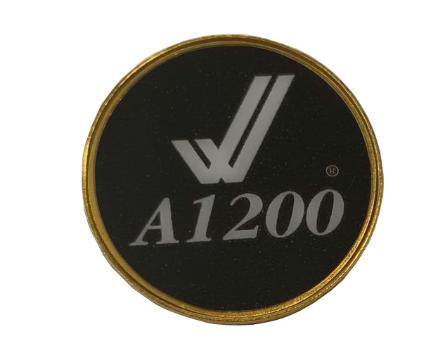 Brass badge with official A1200 logo with double tick logo on black background.