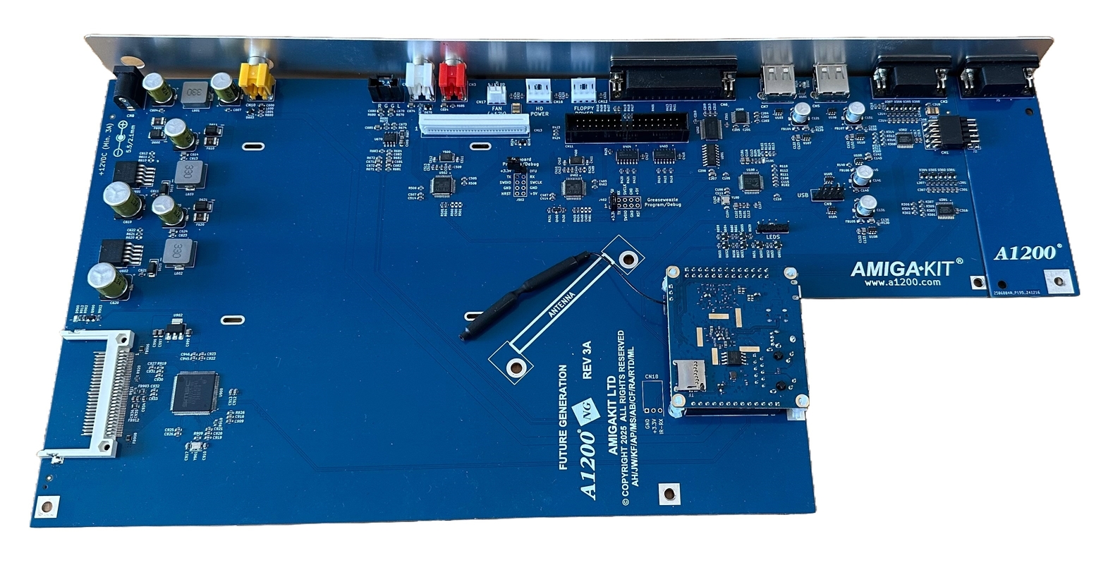 The A1200NG motherboard fits into original Commodore 1200, Escom 1200 and reproduction desktop cases. The ports align with the holes in the case using the supplied backplate.