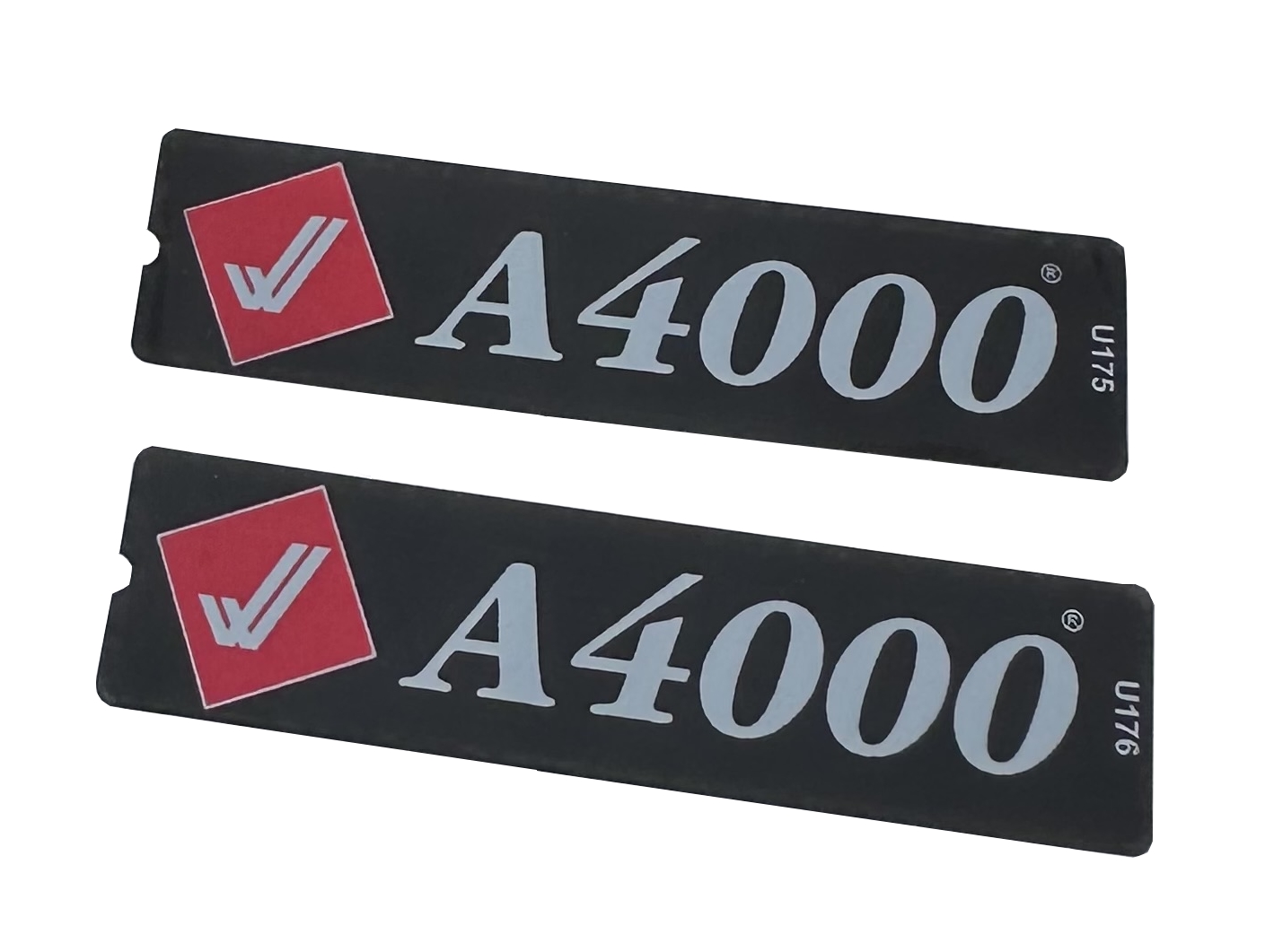 Set of 2 labels marked U175 and U176. A4000 logo has silver metallic appearance. Double check/tick is also silver in colour on a red metallic diamond.