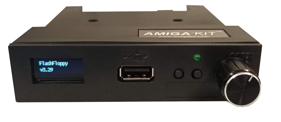The Amiga Gotek floppy drive emulator plugs into the Amiga's 34-pin foppy conenctor and emulates a floppy disk. It accepts a USB flash drive which is connected into the front USB socket. Games and other Amiga disk images can be stored an the optional USB flash drive in Amiga Disk Format (ADF) and then loaded by a menu.