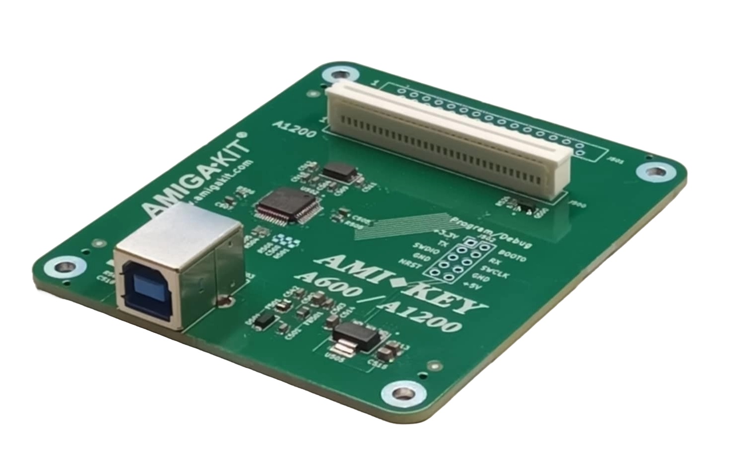 Connect the green / blue ribbon cable of the Amiga keyboard to AmiKey and then plug into a PC / Mac / Raspberry PI or even an A600GS.