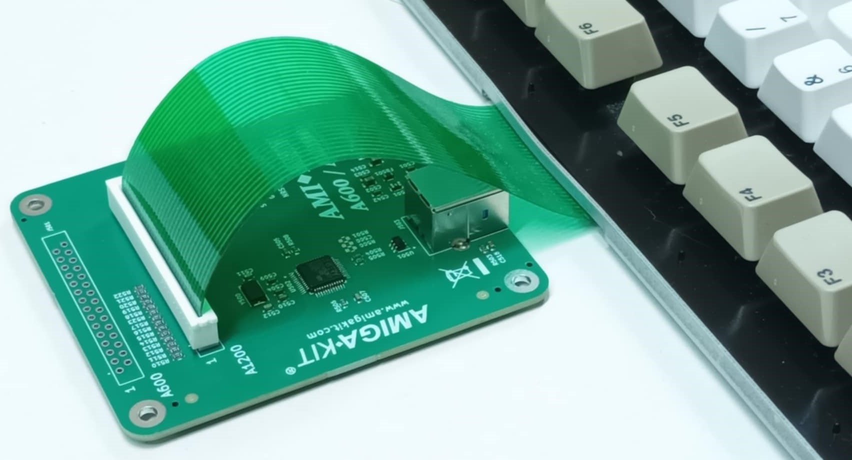 Connect the green / blue ribbon cable of the Amiga keyboard to AmiKey and then plug into a PC / Mac / Raspberry PI or even an A600GS.