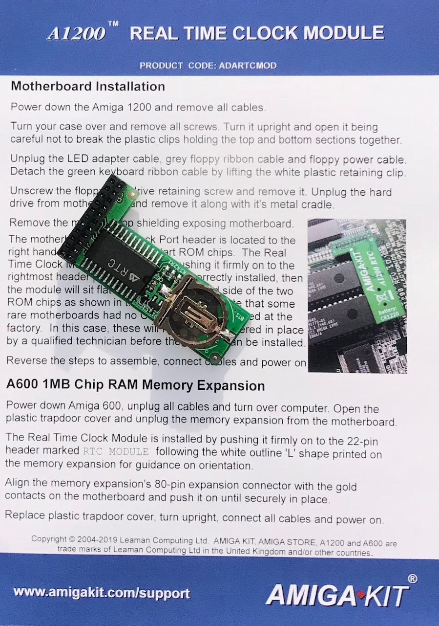 Installation is straight forward: the clock module plugs onto the header pins of a compatible Amiga 1200 motherboard, accelerator or RAM expansion. We can install this onto a compatible accelerator if you purchase them both at the same time and request in the order notes during Checkout.